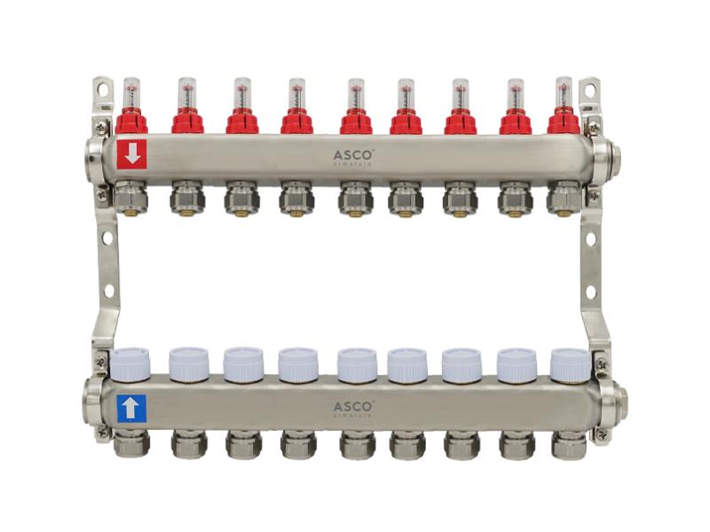 Колекторна група ASCO armatura використовується в системах водопостачання та опалення. Вона забезпечує рівномірну підтримку тиску та надходження води для всіх приладів та контурів у системі водопостачання (крани, душ, пральна машина тощо) або опалення (тепла підлога). Виготовлена з нержавіючої сталі та має дев'ять виходів з різьбою 1" для підключення металопластикових труб або РЕХ-труб Ø16 мм з товщиною стінок 2 мм. Для зручності контролю роботи оснащена вбудованими витратомірами. Колекторна група постачається у фірмовій картонній коробці зі штрихкодом. У комплект входить колекторна група з кріпленнями. Розмір коробки: 47,5 х 34 х 4,5 см. Виробництво: Китай.