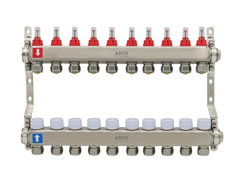 Колекторна група ASCO armatura використовується в системах водопостачання та опалення. Вона забезпечує рівномірну підтримку тиску та надходження води для всіх приладів та контурів у системі водопостачання (крани, душ, пральна машина тощо) або опалення (тепла підлога). Виготовлена з нержавіючої сталі та має десять виходів з різьбою 1" для підключення металопластикових труб або РЕХ-труб Ø16 мм з товщиною стінок 2 мм. Для зручності контролю роботи оснащена вбудованими витратомірами. Колекторна група постачається у фірмовій картонній коробці зі штрихкодом. У комплект входить колекторна група з кріпленнями. Розмір коробки: 52,5 х 34 х 4,5 см. Виробництво: Китай.