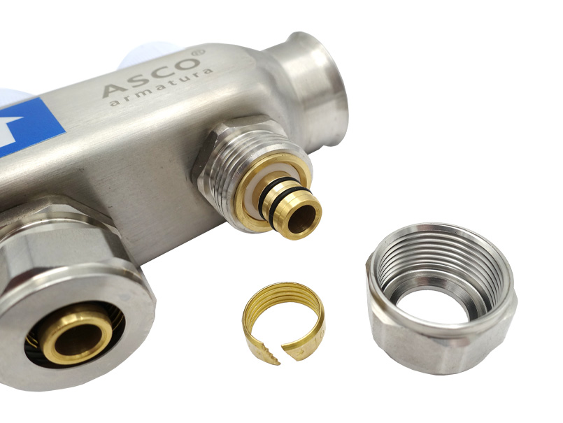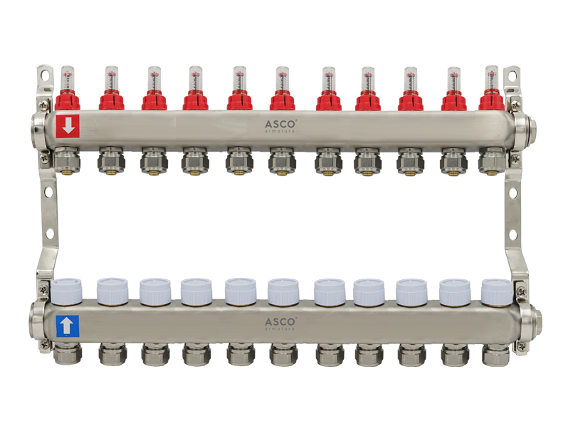 Колекторна група ASCO armatura використовується в системах водопостачання та опалення. Вона забезпечує рівномірну підтримку тиску та надходження води для всіх приладів та контурів у системі водопостачання (крани, душ, пральна машина тощо) або опалення (тепла підлога). Виготовлена з нержавіючої сталі та має 11 виходів з різьбою 1" для підключення металопластикових труб або РЕХ-труб Ø16 мм з товщиною стінок 2 мм. Для зручності контролю роботи оснащена вбудованими витратомірами. Колекторна група постачається у фірмовій картонній коробці зі штрихкодом. У комплект входить колекторна група з кріпленнями. Розмір коробки: 57,5 х 34 х 4,5 см. Виробництво: Китай.