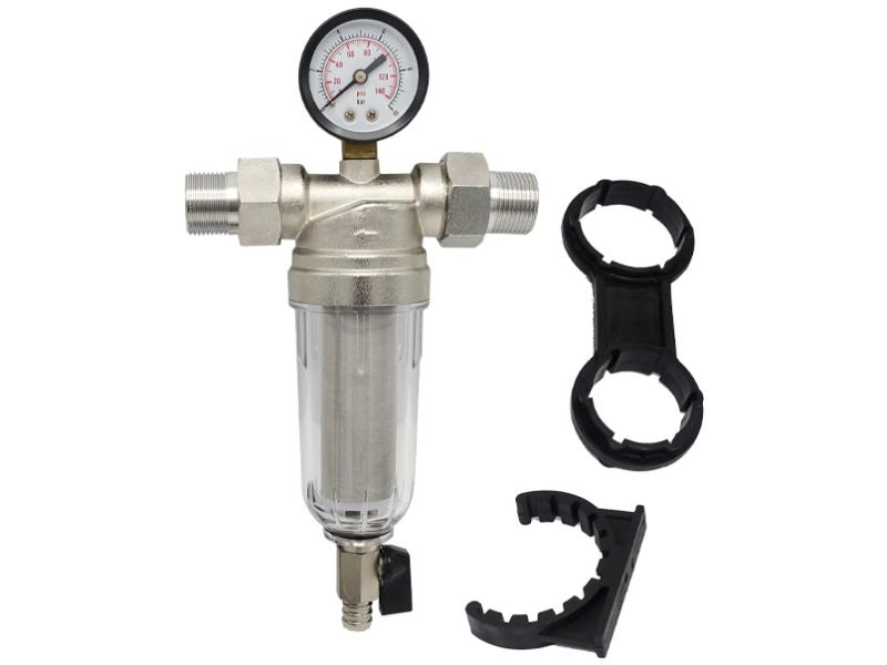 Самопромивний фільтр V&G призначений для очищення води від механічних забруднень (піску, іржі, опадів та інших домішок) у системах центрального водопостачання. Він захищає підключені пристрої (бойлери, пральні та посудомийні машини) та продовжує термін їхньої служби. Корпус фільтра виконаний з нікельованої латуні та оснащений різьбовими виходами 1/2" ЗЗ. Вода проходить через фільтрувальний картридж, а забруднення осідають в пластмасовому стаканчику. Для очищення фільтра достатньо відкрити спусковий кран. Модель має манометр для контролю тиску води. Фільтр встановлюється горизонтально, але зливний кран повинен розташовуватися вертикально (вниз). Постачається у фірмовій картонній упаковці зі штрихкодом. Розмір коробки: 28,5 × 19,5 × 8,2 см. Виробництво: Китай.
