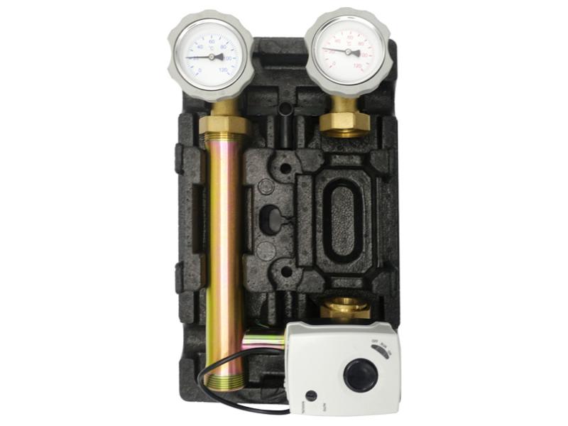 Насосний модуль без насоса V&G призначений для підключення до опалення теплої підлоги або інших контурів із низькотемпературним режимом роботи. Конструкція складається з двох паралельно розташованих потоків, подавального та зворотного, на відстані 180 мл. Кожен потік оснащений індикатором контролю температури теплоносія. У нижній частині вони з'єднані колектором, що забезпечує стабільну циркуляцію потоку. Корпус виконаний з латуні та має різьбові виходи 11/2" для підключення до системи опалення. Електричний термостат дозволяє підтримувати задану температуру контуру. Модуль сумісна з електричними циркуляційними насосами. Постачається в зібраному вигляді й в фірмовій картонній упаковці з ложементом, що забезпечує захист від пошкоджень при транспортуванні. Коробка має штрихкод та розмір 44 х 26 х 23,5 см. Виробництво: Китай.