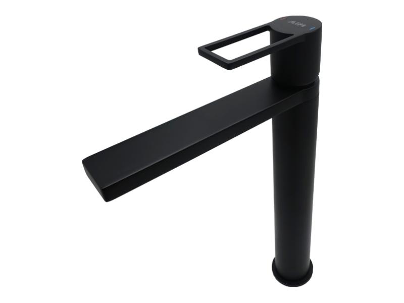 Змішувач для раковини AIM — ідеальне рішення для великих умивальників. Виготовлений із міцної латуні та має матове чорне покриття. Подовжений корпус висотою 26 см дуже стійкий і не схильний до розхитування. Для запобігання протіканню змішувач додатково оснащений ущільнювальною прокладкою. Нерухомий гусак довжиною 16 см обладнаний аератором для економної витрати води при збереженні напору та попередньої фільтрації. Гусак оптимально розташовується над виливом раковини, що не допускає розбризкування. Верхній важіль з керамічним картриджем плавно і точно регулює напір і температуру води. Прямокутна ручка зі зручним прорізом дозволяє легко керувати змішувачем навіть мокрими або мильними руками. На важіль нанесені кольорові маркери подачі холодної та гарячої води для комфортного використання. Змішувач кріпиться на умивальник за допомогою притискної гайки. Не вимагає особливого догляду — достатньо періодично протирати його вологою ганчірочкою. Постачається у фірмовій картонній коробці зі штрихкодом. В комплект входять: змішувач для раковини з прокладкою, 2 підводні шланги, гайка з прокладками, інструкція, гарантійний талон, трикотажні рукавички. Розмір упаковки — 368х270х74 мм. Гарантія — 5 років. Виробництво — Китай.
