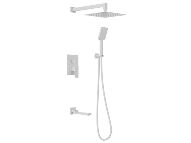 Комплект для душової кабіни AIM білого матового кольору призначений для прихованого монтажу, що дозволяє заощадити простір. Виготовлений із міцної латуні та покритий антикорозійним хромом, який захищає від корозії та подряпин. До складу комплекту входять: змішувач з керамічним картриджем, гусак, верхній душ, багаторежимна ручна лійка зі шлангом і настінним тримачем, важіль. Змішувач з керамічним картриджем вбудовується в стіну: зовні залишається декоративна панель із важелем-прапорцем для регулювання напору та температури води, а також кнопковий перемикач режимів з ванни на душ. Вода може подаватись через гусак довжиною 20 см у ванну або перемикатися на ручний або верхній душ. Ручна лійка оснащена кнопковим перемикачем режимів, а настінний душ (24,5х24,5 см) має опуклі форсунки, які формують м'який струменів. Комплект монтується в стіну і не потребує особливого догляду. Постачається в міцній картонній коробці (382х478х163 мм) зі штрихкодом. В комплект входять: змішувач, гусак, душова лійка зі шлангом і тримачем, верхня настінна, декоративна панель, важіль, кріплення, трикотажні рукавички, інструкція, гарантійний талон. Гарантія: 5 років. Виробництво: Китай.