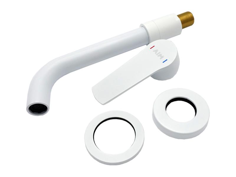 Комплект для раковини прихованого монтажу AIM виготовлений із міцної латуні та має матове біле покриття, яке захищає його від корозії та подряпин. Складається з двох частин, змішувача та виливу. У стіну встановлюється змішувач із керамічним картриджем, що дозволяє приховати всі комунікації та зменшити шум води. Зовні виводяться важіль-прапорець для регулювання напору та температури води, а також вилив. Важіль дуже зручний в управлінні, його можна відвести навіть пальцем, що зручно, якщо руки мокрі або мильні. Гусак (20 см) із закругленим носиком направляє струмінь точно в злив раковини, що не допускає розбризкування і дозволяє комфортно вимити руки. Система прихованого монтажу відрізняється високою зносостійкістю і не потребує особливого догляду. Постачається у фірмовій картонній коробці (250х280х150 мм) зі штрихкодом. В комплект входять: змішувач, важіль, гусак, 2 декоративні чаші, кріплення, рукавички трикотажні, інструкція, гарантійний талон. Гарантія: 5 років. Виробництво: Китай.