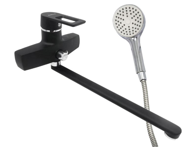 Змішувач для ванни практичного чорного матового кольору ТМ MILLZ відрізняється лаконічним дизайном. Хромована ручка сріблясто-дзеркального кольору контрастно виділяється на фоні чорного корпусу і дозволяє плавно перемикати режими води — з виливу на душ. Верхній важіль зі зручним прорізом для пальців рук регулює натиск та температуру води. Легкий перебіг важелів забезпечують керамічні картриджі. Довгий плоский гусак (34 см) формує рівний потік води, а вмонтований в носик аератор очищає її та не допускає розбризкування. Гофрований металевий шланг (1,5 м) з'єднує змішувач із душовою лійкою (21,5 см). Рівномірно розташовані на робочому диску (Ø 8 см) форсунки мають масажний ефект і створюють рівномірний потік струменів. Лійка зручно лягати в руку, також її можна встановити на настінний тримач. Змішувач вмонтовується на стіну. Постачається в щільній картонній коробці (370 х 173 х 105 мм), маркованій штрихкодом. В комплектацію входять: корпус змішувача, гусак, душова лійка, гофрований шланг, настінний тримач, прокладка, 2 ексцентрики з відбійниками, накладна чаша, інструкція, гарантійний талон. Корпус змішувача запакований у білий тканинний мішечок для захисту від подряпин. Термін служби — 5 років. Гарантійний термін — 12 місяців. Виробник — Китай.