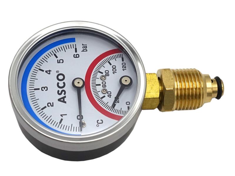 Термоманометр радіальний ASCO Armatura призначений для відображення показань тиску та температури в системах опалення та водопостачання. На термоманометрі діаметром 63 мм позначені два циферблати: синій для контролю тиску (до 6 bar) та червоний для контролю температури (від 0 до 120°C). Термоманометр має латунний вихід із зовнішньою різьбою для підключення до опалення. Встановлюється через клапан і не потребує особливого монтажу. Постачається у фірмовій картонній коробці зі штрихкодом. Розмір коробки: 8 × 6,5 × 3,3 см Гарантія: 12 місяців. Виробництво: Китай.