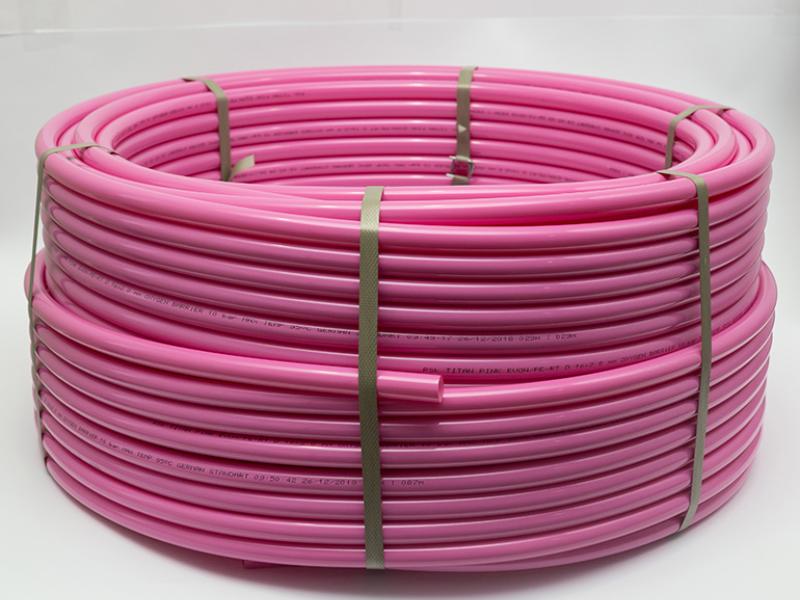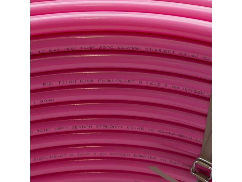 Труба EVOH/PE-RT оригінального рожевого кольору для теплої підлоги від бренду RSk під назвою ТITAN PINK діаметром 16 мм, товщина стінки 2,0 мм, з кисневим шаром OXYGEN BARRIER, продається цілими бухтами по 100, 200 і 600 метрів. Вони відрізняються хорошою гнучкістю, теплопровідністю і хімічною інертністю. Вона розрахована на максимальний тиск 10 бар і температуру рідини до 95˚С. Завдяки поєднанню шарів ЕVOH/PE-RT виключається проникнення кисню в систему (Oxygen Barrier) внаслідок чого вона менше піддається впливу корозії. Переваги труб PE-RT для теплої підлоги: міцність, герметичність і монолітність змонтованої системи. Висока гнучкість труб (важлива при створенні систем з багатьма і крутими вигинами). Підвищена стійкість до мінусових температур. Термін служби систем теплої підлоги при дотриманні умов експлуатації і монтажу становить до 50 років.