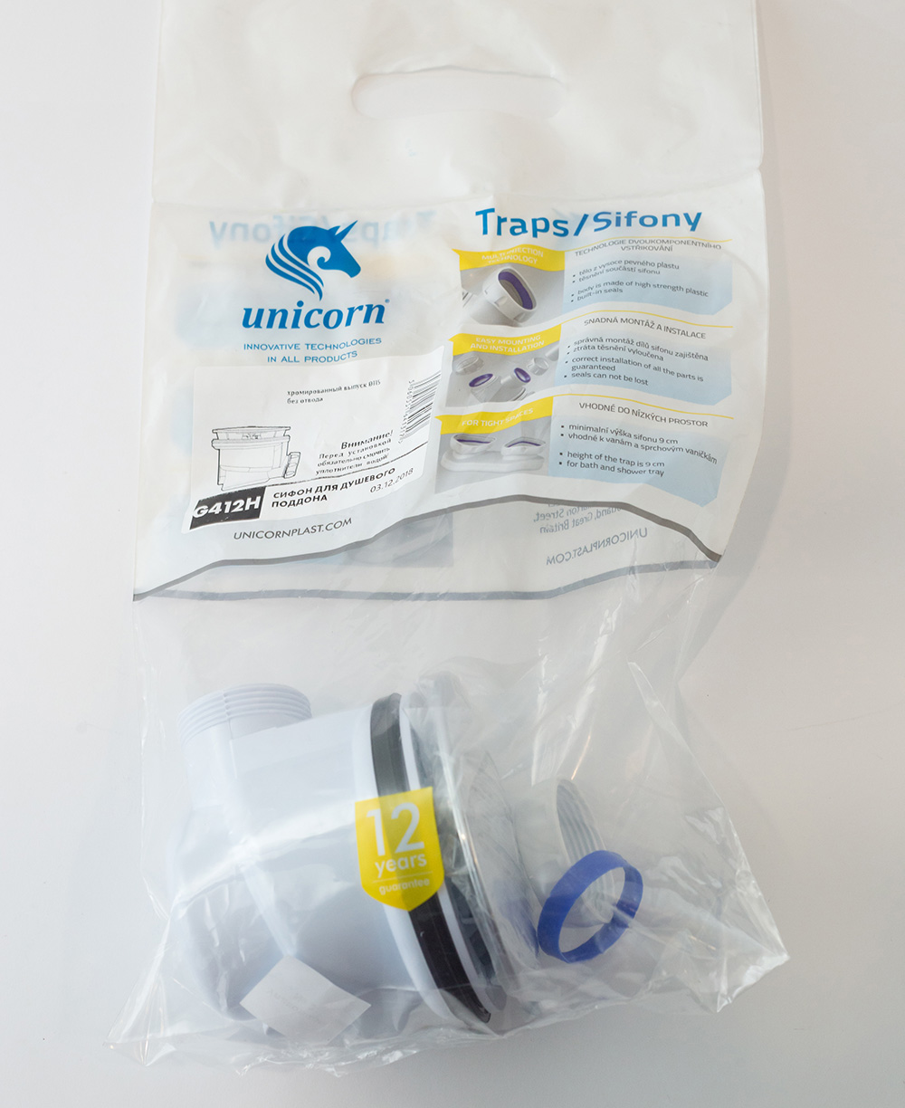 Сифон для душової кабіни Ø115 UNICORN без відводу G412H. Важлива особливість такої моделі полягає в тому, що гумові ущільнювачі контрастного синього кольору вже інтегровані в корпус сифона завдяки використанню багатокомпонентного лиття (технологія Multi-Injection). Це значно прискорює його монтаж і мінімізує ймовірність протікань. Сифон часто наражається на небезпеку з боку механічних пошкоджень під час експлуатації. Щоб максимально мінімізувати такі ризики, в моделі реалізовано практику Increased Strength (підвищена міцність), спрямовану на виготовлення ущільнювачів з термоеластопласту, що забезпечує додаткову щільність і міцність, а також використовується високоміцний пластик, з якого зроблений корпус. Схема та інструкція з монтажу зображена на упаковці, а чашка сифона поставляється в зібраному вигляді, що полегшує і пришвидшує монтаж сифона. Гарантія – 12 років.