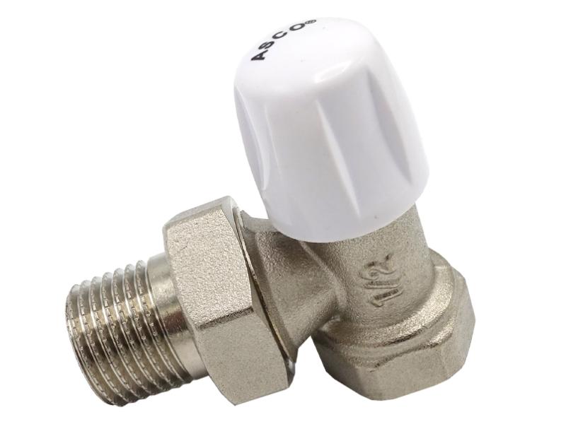Кран радіаторний 1/2" кутовий зворотній ASСO використовується в системах опалення, а також застосовується на трубопроводах систем питного і господарського призначення, гарячого водопостачання, на технологічних трубопроводах, що транспортують рідини, неагресивні до матеріалів крана. Основне призначення радіаторного крана - плавне регулювання витрати теплоносія через опалювальні прилади. У кранах ASCO Armatura в регулюючому механізмі не використовуються гумові деталі. Регулювання виконується за допомогою латунних деталей. Група радіаторних кранів представлена хромованими і нікельованими прямими і кутовими моделями, кранами під ключ запірними і кранами під термоголовку. Виробник Туреччина, торгова марка: ASCO armatura, робочий тиск: 0,8 МПа, робоча температура середовища, що транспортується: 120 С, допустима температура навколишнього середовища: від +5 до +45°С. Корпус виготовлений з нікельованої латуні CW617N, різьба зовнішня 1/2 ", регулювання - механічне.