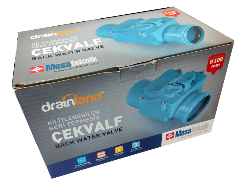 Каналізаційний зворотній клапан 110 мм синього кольору Drainland, завод-виробник Mesa Teknik Туреччина, виготовлений з якісного ABS пластику EN 1455. Термопластичний листовий конструкційний матеріал корпусу має підвищену ударостійкість та пружність, тому повністю захищений від появи тріщин внаслідок тиску води. Кришка клапану кріпиться надійними сталевими болтами A2-70 та має аварійний перемикач заслону. Завдяки конструкції клапану Drainland Mesa Teknik Ваш будинок захищений від зворотнього потоку води та бактерій. Клапан запакований у заводську картонну коробку та готовий до продажу.
