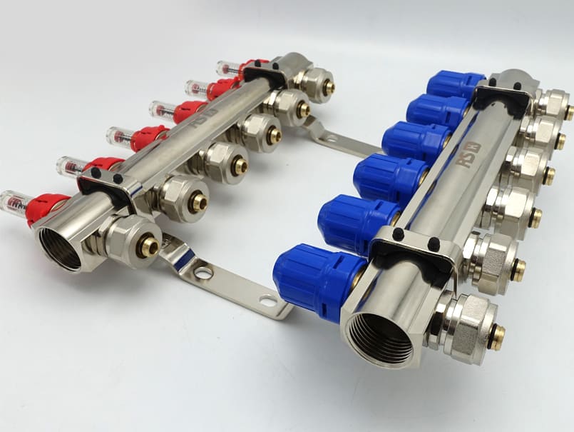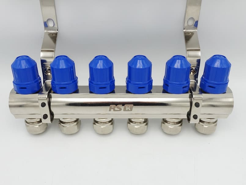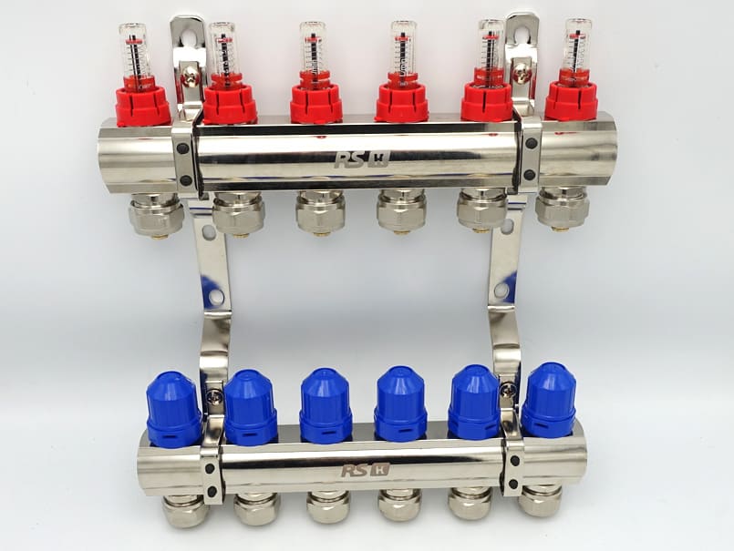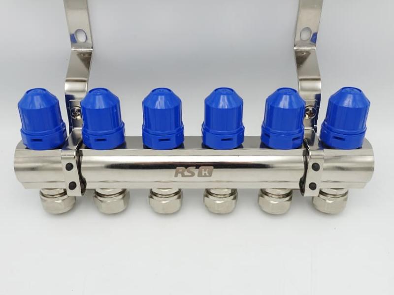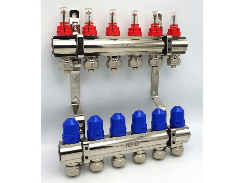 Колекторна група із вбудованими витратомірами бренду RSk (Італія) зі стійким нікелевим глянцевим покриттям. З євроконусами. Кількість виходів: від 2 до 12. Діаметр виходів 1 "х 16. Матеріал: латунь CW617N, покриття - нікель. Кріплення в комплекті. Упаковка - картон з ложементом. Завдяки йому колектор не пошкодиться при трансортуванні. Колекторна група RSk (Італія) з витратомірами використовується в системах опалення та гарячого водопостачання, дозволяючи створити і забезпечити надійну стабільну роботу системи теплої підлоги. Вона дає можливість значно спростити систему, виключивши з неї додаткову арматуру. Витратоміри дозволяють знизити температуру підлоги в окремих приміщеннях, де, наприклад, на даний момент ніхто не живе. у цілому колекторна група в зборі RSk призначена для виконання своєї головної функції - забезпечення рівномірного тиску і надходження води для всіх приладів і контурів в системі. Комплект поставки колекторної групи для теплої підлоги включає подає колектор з витратомірами, зворотний колектор і кріплення. Габарити коробки: 380*430*60 мм