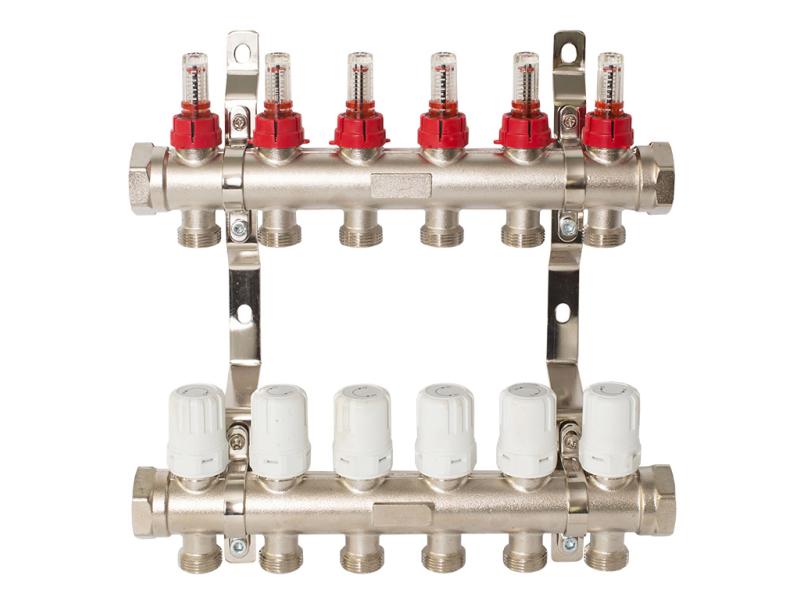 Колекторна група з вбудованими витратомірами. Кількість виходів: від 2 до 12. Діаметр виходів 1 "х 3/4". Матеріал: латунь, покриття - нікель. Кріплення в комплекті. Колекторна група з витратомірами використовується в системах опалення та гарячого водопостачання, дозволяючи створити і забезпечити надійну стабільну роботу системи теплої підлоги. Вона дає можливість значно спростити систему, виключивши з неї додаткову арматуру. Витратоміри дозволяють знизити температуру підлоги в окремих приміщеннях, де, наприклад, на даний момент ніхто не живе. В цілому колекторна група в зборі призначена для виконання своєї головної функції - забезпечення рівномірного тиску і надходження води для всіх приладів і контурів в системі. Комплект поставки колекторної групи для теплої підлоги включає подає колектор з витратомірами, зворотний колектор і кріплення.